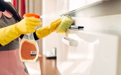 Housemaid cleans furniture with a cleaning spray