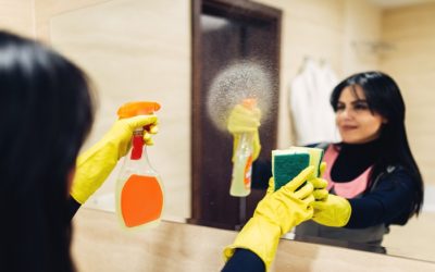 Housemaid cleans the mirror with a cleaning spray
